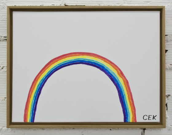 Vinculado a la vanguardia neoyorquina, Christopher Knowles, artista plástico y poeta, nos aproxima con la exposición New Paintings a un mundo de introspección e ingenuo trazo infantil (fíjense en su enorme firma). Knowles aplica color plano sobre el lienzo y en los huecos incorpora elementos sencillos como un despertador o un arcoíris. En muchas de sus obras, la inserción de texto está relacionada con sus poemas onomatopéyicos, donde los signos se convierten en forma. La enumeración y el uso reiterado de las palabras es habitual en su obra. Este imaginario poético está relacionado con el autismo que padece desde su nacimiento.